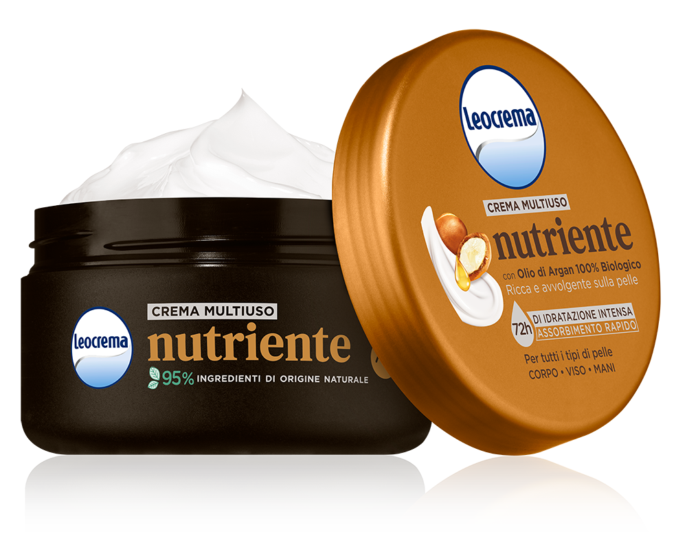 Crema multiuso nutriente con Olio di Argan 100% biologico. Ricca e avvolgente sulla pelle.